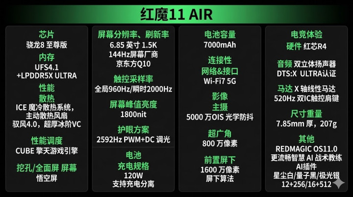 这回红魔11 Air最大的看点其实不是单纯的性能,而是身材。处理器用上骁龙8至尊版,电池干到7000mAh,屏幕是6.85英寸的1.5K真全面屏。最离谱的是,这货在塞进主动散热风扇的情况下,厚度还压到了7.85mm,重量也就207g左右。