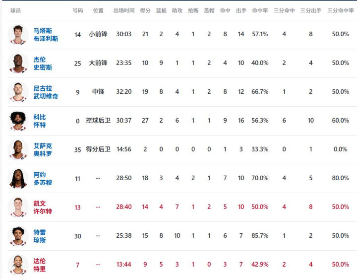 数据方面,科比·怀特贡献27分,哈登空砍24分。此外,公牛外线火力炸裂,全场命中23记三分,为大胜奠定基础。