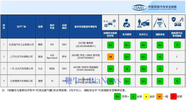 耐撞性与维修经济性:腾势N9、大众探岳L获G+(优秀+),理想i8获G(优秀),奥迪A5LSportback获M(一般);腾势N9、大众探岳L结构耐撞性优秀,3款车型可维修性优秀,大众探岳L维修经济性优秀,3款车型碰撞兼容性优秀,腾势N9、大众探岳L、理想i8获低速主动安全加分,其中腾势N9、理想i8获评优秀。