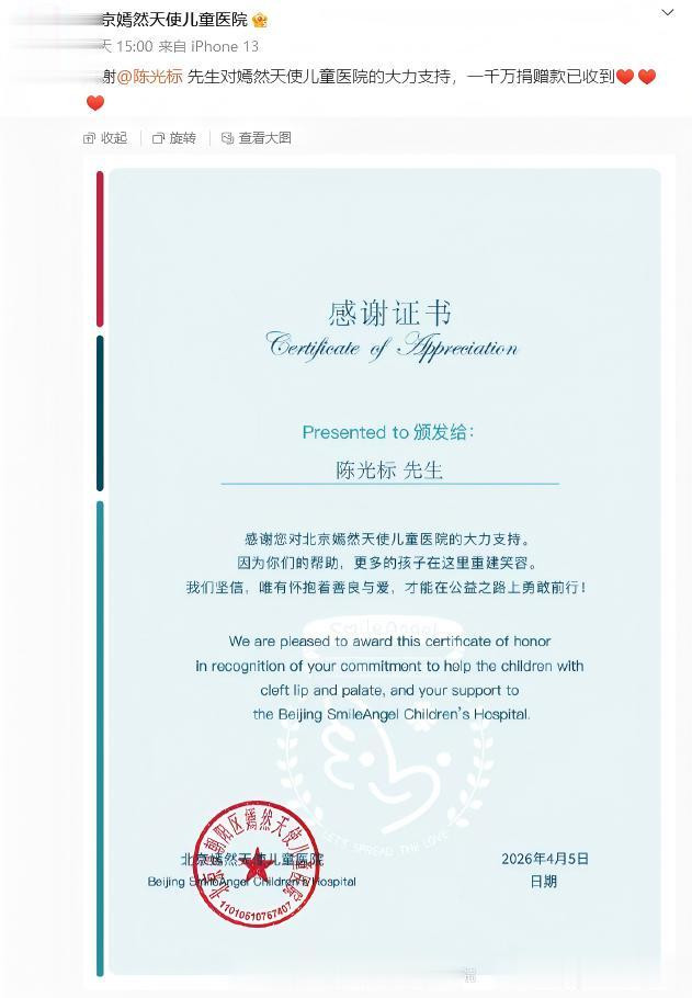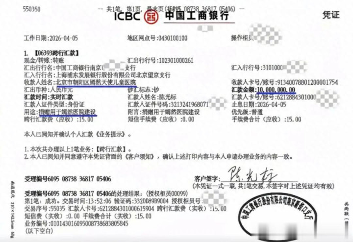 4月5日,陈光标晒出了一张银行汇款单,上头流露他已向北京市向阳区嫣然天神儿童病院转账1000万元。