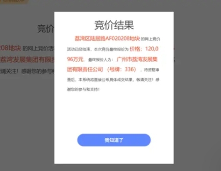 行为广州白鹅潭商务区中枢区的要点商办地标地块,荔湾区陆居路AF020208地块3月27日10时慎重开启限时竞价。最终,荔湾发展集团拿下该地块,总价为120096万元。