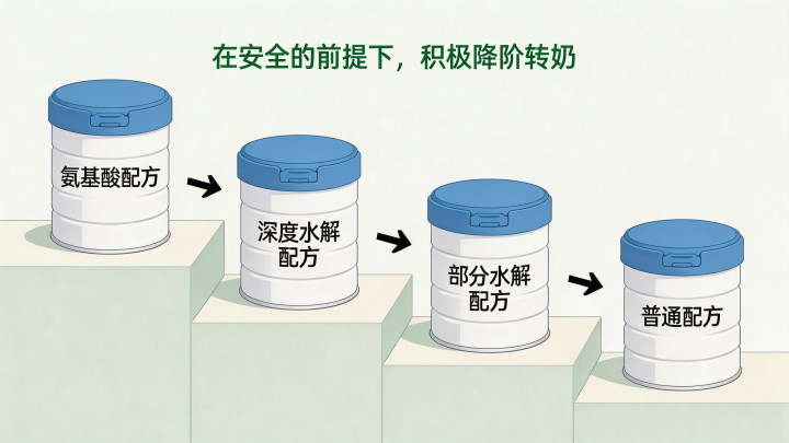 调养牛奶卵白过敏的打算,毫不是让孩子一辈子喝罕见奶粉,而是在适度症状的同期,积极匡助孩子重新招揽普通牛奶卵白。因此,咱们罢黜“氨基酸配方 → 深度水解配方 → 部分水解配方 → 普通配方”的门路式转奶原则。