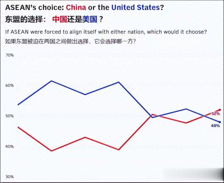 如东盟11国,被动在中好意思之间选边站,有52%的受访者聘请了中国,48%聘请了好意思国。这一数据相较一年前好意思国显然逾越中国的情况,出现了显然逆转。